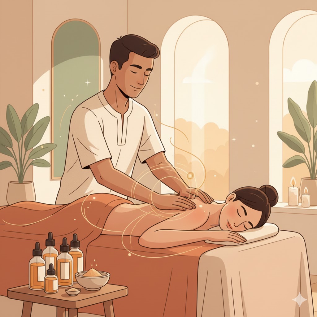- Été (feu Pitta) : massage rafraîchissant + harmonisation énergétique pour apaiser colère et excès d'activité mentale