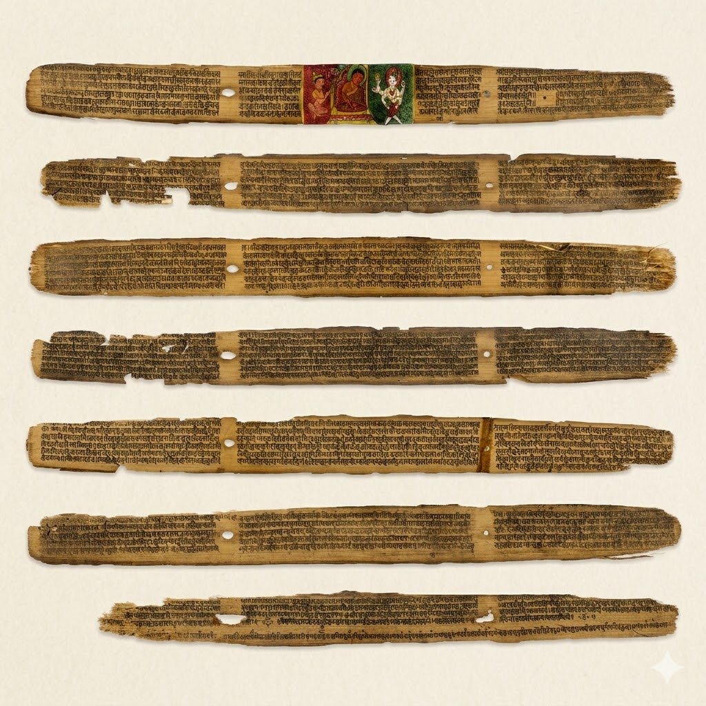 (Ci-dessus : feuilles de palmier de la Suśruta Saṁhitā, conservées au Los Angeles County Museum of Art.)
